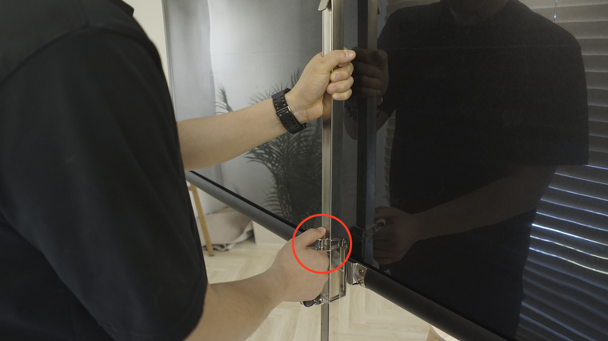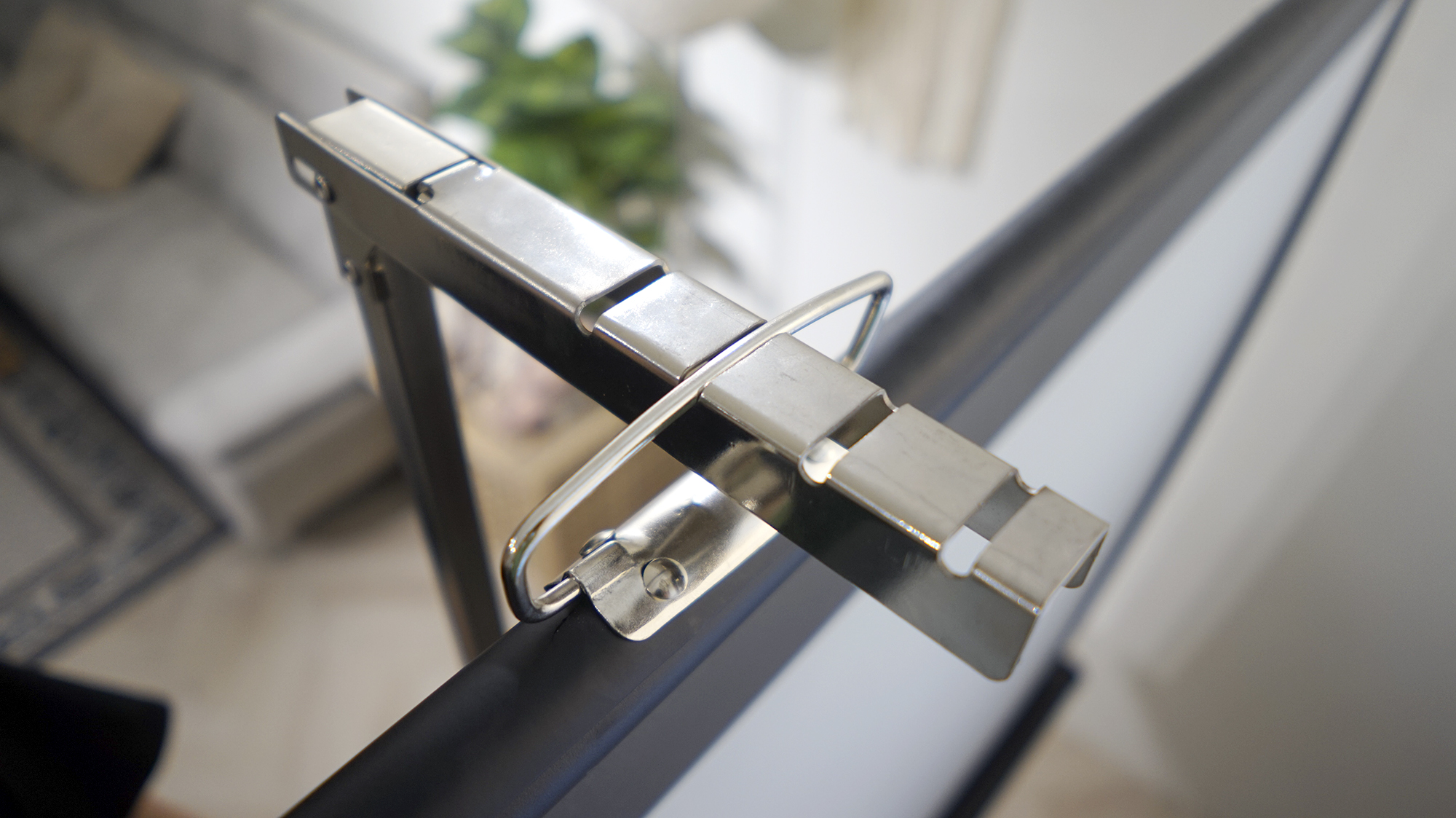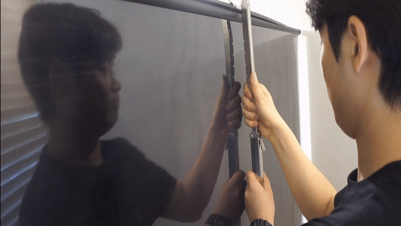 ▶ 스크린을 천천히 잡아 당겨 상단에 있는 홈에 걸어줍니다.