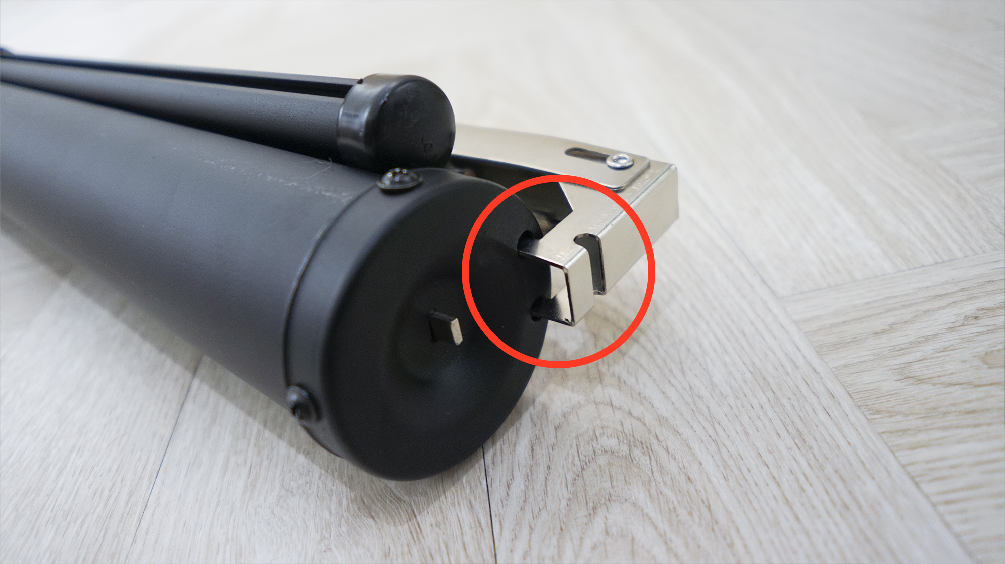 삼각대 다리의 반대쪽, 상단 부분의 구멍에 기둥 머리를 꽂아줘야 삼각대가 풀리지 않습니다. (잠금 장치)